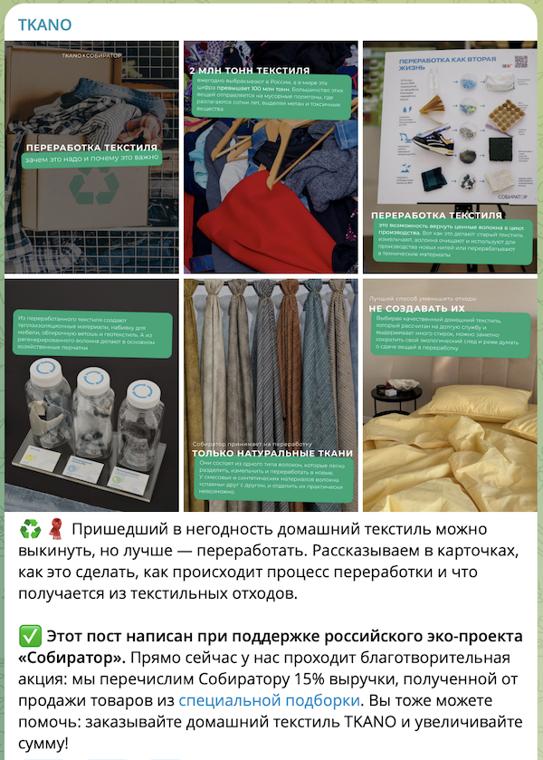 При выборе партнёра TKANO ориентировались на проекты, которые системно работают с темой переработки и просвещения: «Собиратор оказался максимально созвучен нашему подходу — через конкретные действия, прозрачную механику и уважительное отношение к участникам. Я изучила соцсети, очень понравилась ваша наполненность и погружение в экосреду, глубокое изучение проблемы, подсвечивание фактов, а не просто поверхностная информация, это очень подкупило и уже не было сомнений, что хочется вас поддержать и осветить тему Всемирного дня переработки более широко».