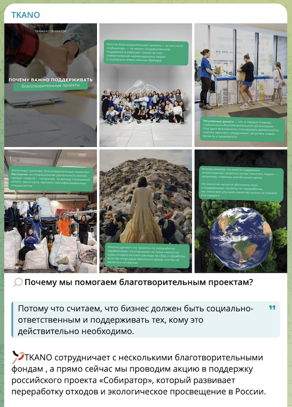 В кейсе TKANO подробно поделились, как им удаётся поддерживать фонды и выстраивать коммуникацию с аудиторией так, чтобы их экологические инициативы стали частью естественной частью бренда, а не разовой акцией для привлечения внимания.